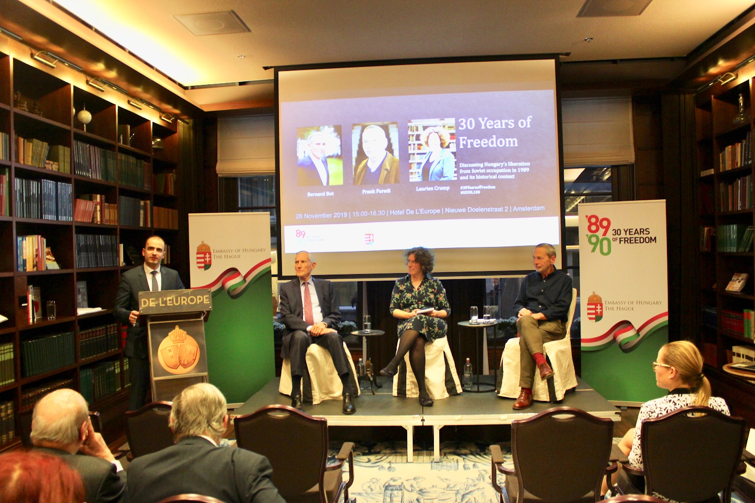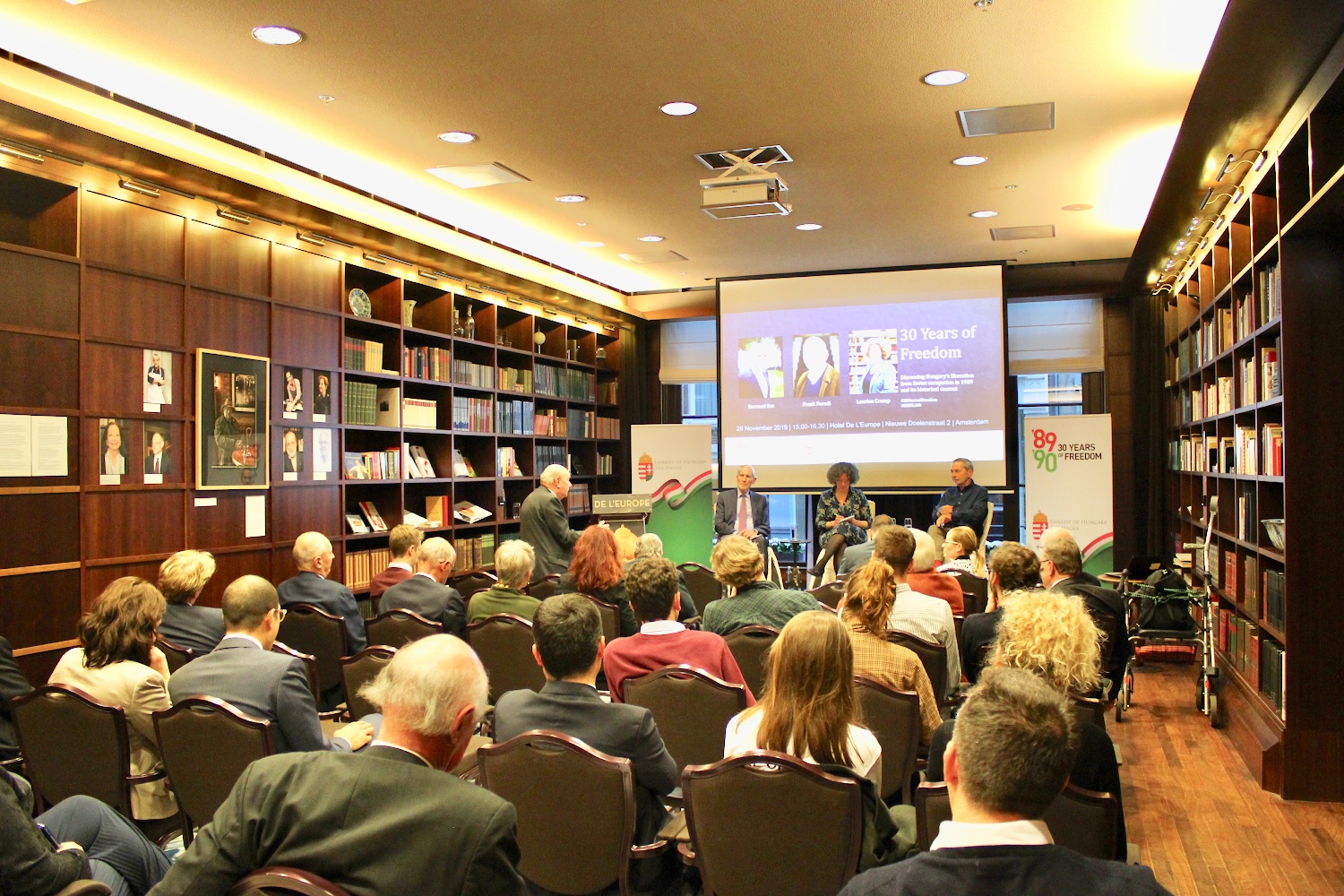 Kocsis András nagykövet nyitóbeszédét követően Laurien Crump, az Utrechti Egyetem történelem tanszékének professzora foglalta össze az 1989-es eseményeket, amely Magyarország kommunista uralom alóli felszabadulását jelentette. Bernard Bot, volt holland külügyminiszter és Frank Füredi, a Kenti Egyetem magyar származású szociológus professzora is megosztották gondolataikat a rendszerváltásról és annak jelentőségéről a jelenkori európai politika tükrében. Bot miniszter a párbeszéd fontosságát hangsúlyozta ki a kétoldalú kapcsolatokban, Füredi professzor pedig a szabadság és a nemzeti szuverenitás jelentéséről és jelentőségéről beszélt.