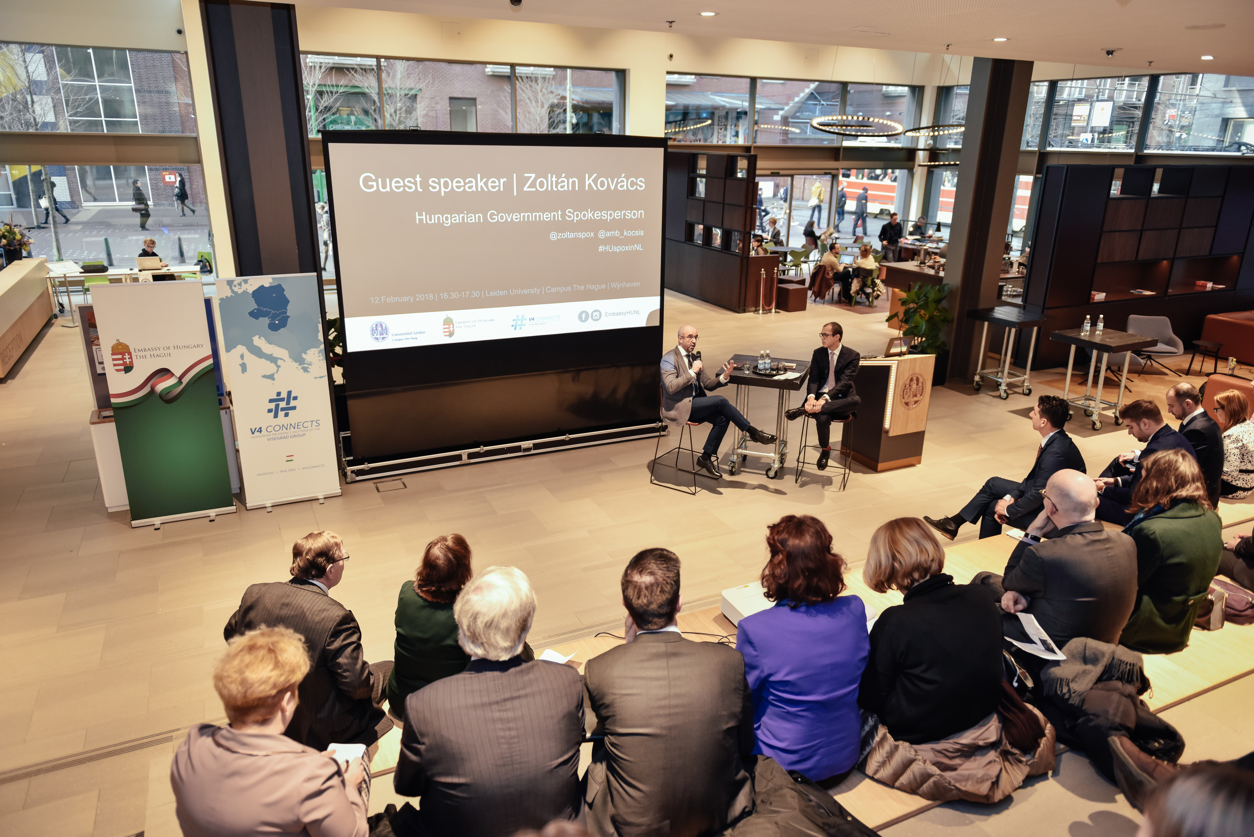 Kovács Zoltán kormányszóvivő február 12-ei hollandiai látogatása során háttérbeszélgetést folytatott a holland sajtó képviselőivel, valamint találkozott Sybrand Bumaval, a kereszténydemokrata párt (CDA) vezetőjével, alsóházi frakcióvezetővel. Szóvivő úr a délután folyamán a Leideni Egyetem hágai karán előadást tartott Magyarország EU-ban elfoglalt helyéről, legfontosabb uniós kérdésekben képviselt álláspontjáról, majd közel egy órán át válaszolt a diákok kérdéseire.