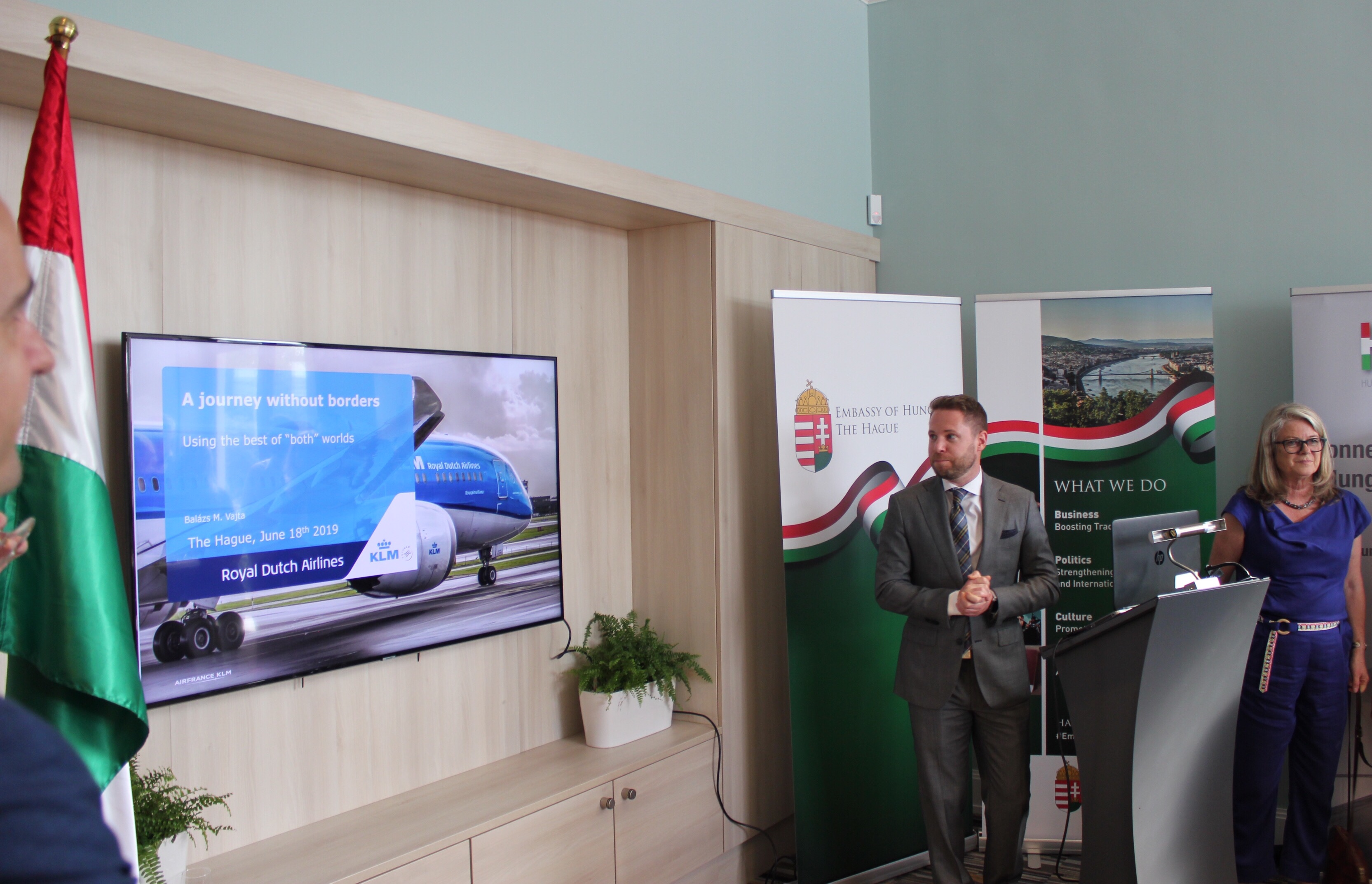 A „Meet Hungary” fogadáson részt vevő 50 üzletembert dr. Kocsis András nagykövet és Cisca Ansem, a HBN elnöke köszöntötte, a rendezvényen meghívott vendégünk, Vajta Balázs a KLM stratégiai ügyekért felelős igazgatója, Boing B737 pilóta tartott előadást a KLM holland légitársaságról.